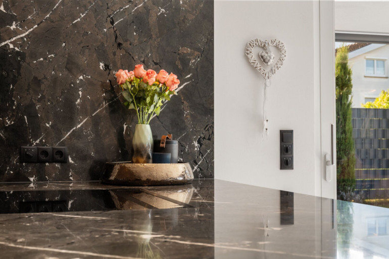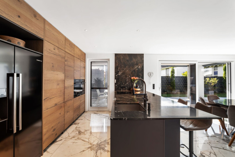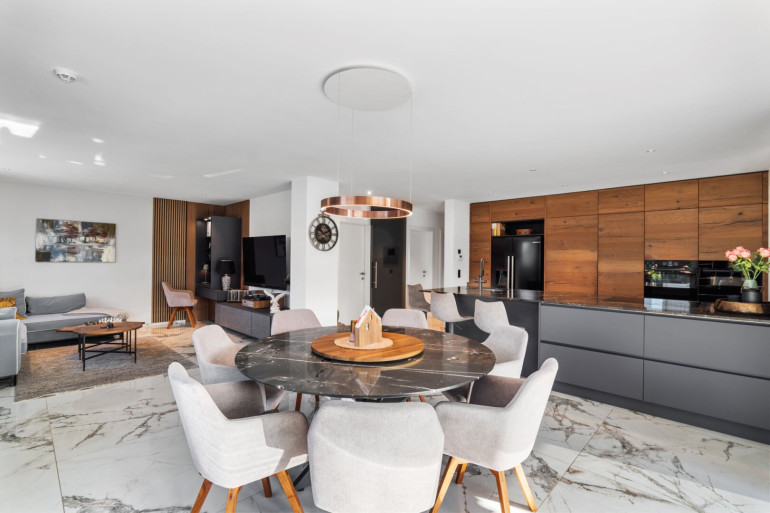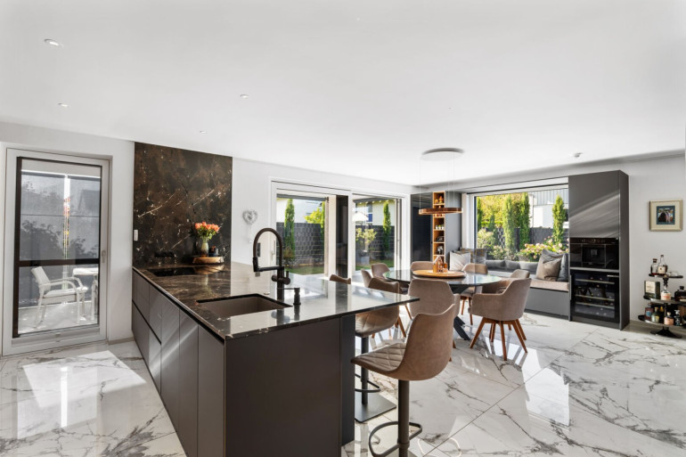 Der offen gestaltete Wohn- und Essbereich mit hochwertiger Einbauküche bildet das Herzstück des Hauses und schafft eine einladende Atmosphäre zum Verweilen und Genießen. Die Küche überzeugt durch ihre erstklassige Ausstattung, eine großzügige Kücheninsel und hochwertige Geräte.