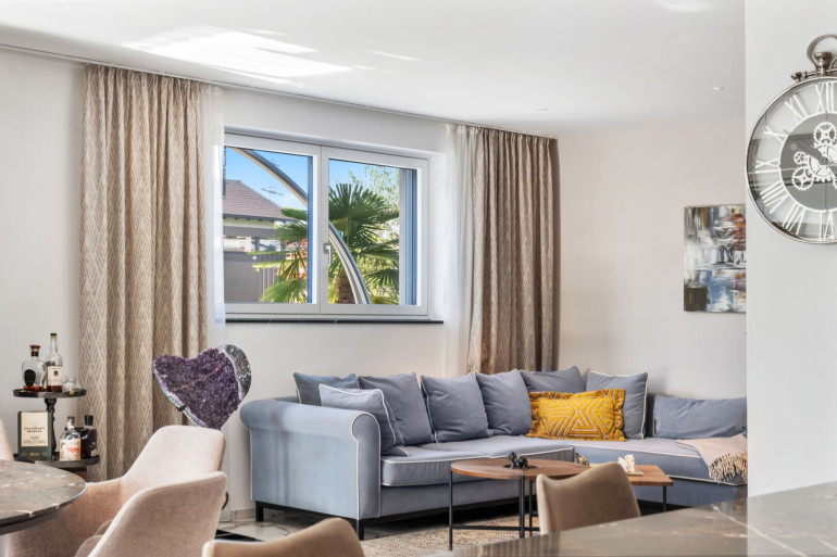 Bereits beim Betreten überzeugt das Haus mit einer klaren, zeitgemäßen Architektur und lichtdurchfluteten Räumen. Großzügige Fensterflächen schaffen eine helle, einladende Atmosphäre und eröffnen einen schönen Blick in den Garten.