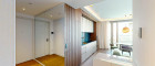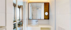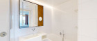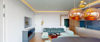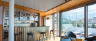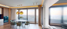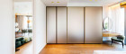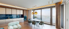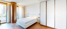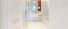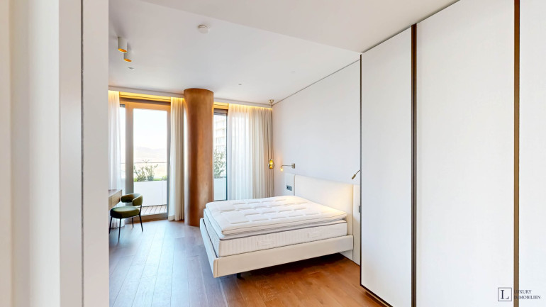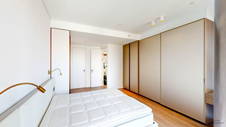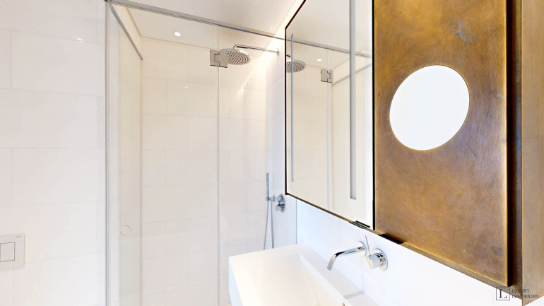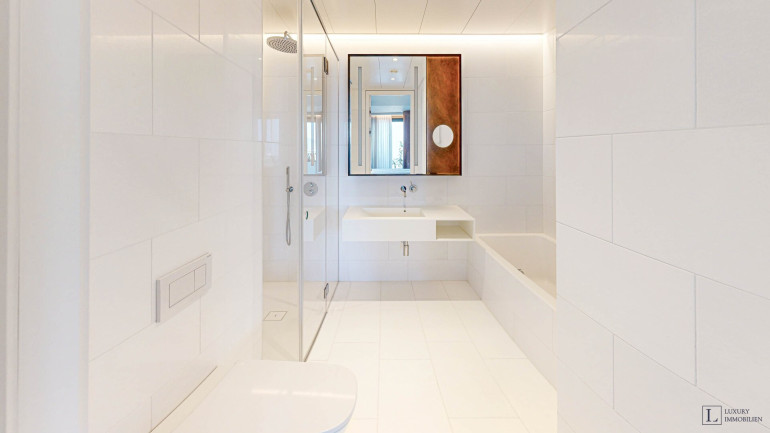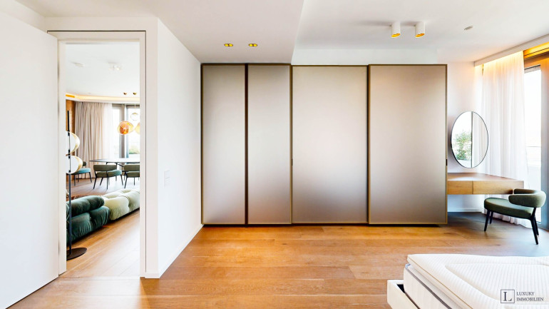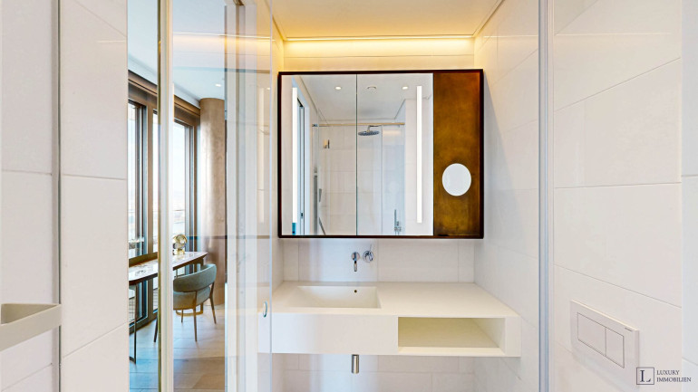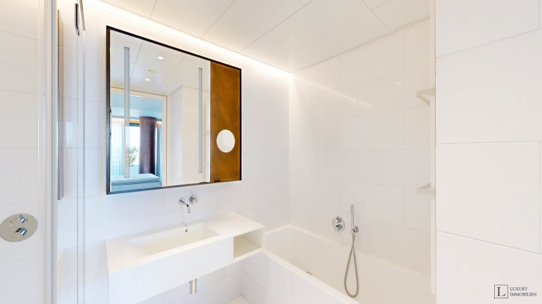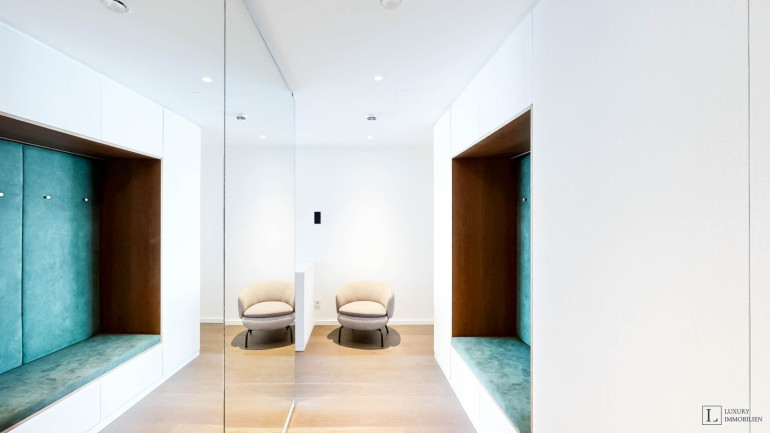 Weitere Ausstattungsmerkmale sind ein Ethanol-Kamin mit Verkleidung aus Zimbabwe-Stein, Einbauschränke in beiden Schlafzimmern, eine maßgefertigte Garderobe im Eingangsbereich mit Sitznische in Alcantara sowie hochwertig ausgestattete Bäder mit individuell gefertigten Möbeleinbauten.