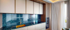 Das Interieur wurde individuell geplant und mit einer warmen, eleganten Materialauswahl umgesetzt. Maßgefertigte Einbauten, Echtholzfurniere, bronzefarbenes Glas sowie dekorative Elemente wie Mosaike von Sicis Neoglass schaffen ein hochwertiges und zugleich wohnliches Ambiente. Jede Lösung folgt dabei einem klaren Zusammenspiel aus Ästhetik, Funktion und räumlicher Leichtigkeit.