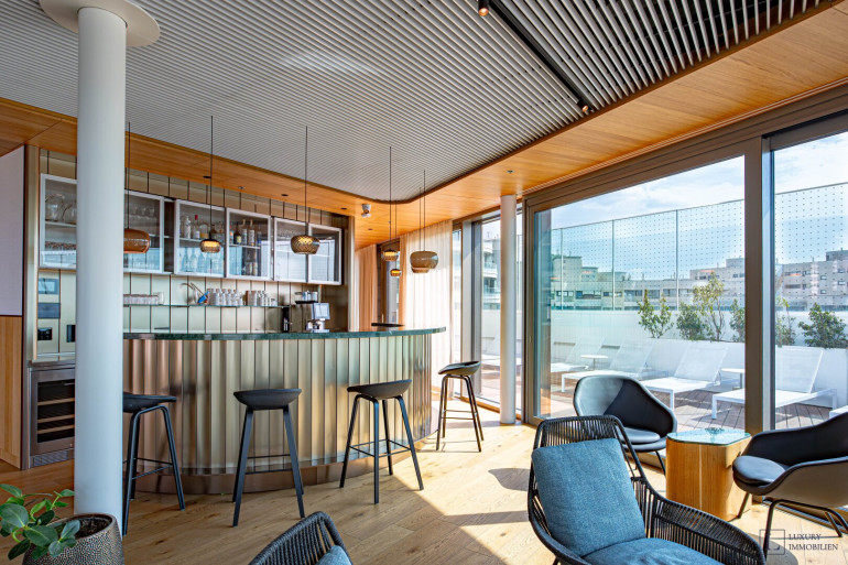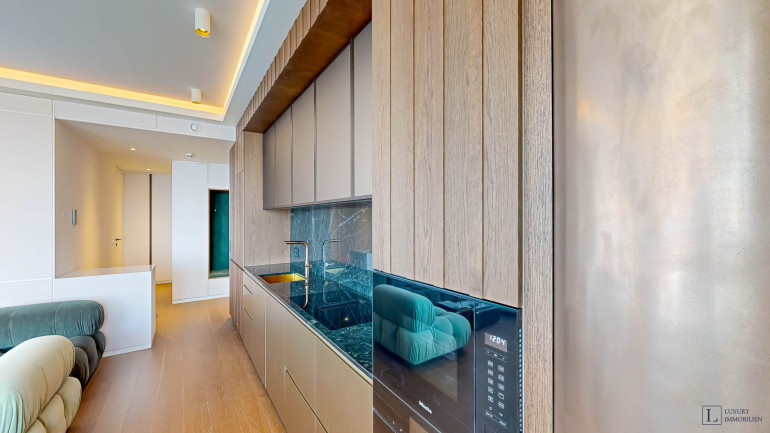 Die Wohnung verfügt über rund 100 m² Wohnfläche und zeichnet sich durch ein durchdachtes Raumkonzept aus, das Großzügigkeit, Licht und ein offenes Wohngefühl in den Mittelpunkt stellt. Herzstück ist der weitläufige Wohn- und Essbereich mit offen gestalteter, maßgefertigter Küche (ca. 33 m²). Bodentiefe Fenster öffnen den Raum zu zwei privaten Balkonen mit Bambusbelag und lassen viel Tageslicht herein, während sie zugleich einen freien Blick über Wien ermöglichen.
