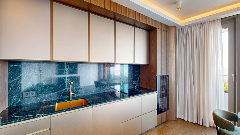 Die maßgefertigte Küche verbindet Gestaltung und Funktion auf höchstem Niveau. Satinierte Glasfronten in Bronzeoptik, eine Arbeitsplatte aus Naturstein Tauern Green sowie hochwertige Einbaugeräte von Miele gehören zur Ausstattung: Dampfbackofen, Induktionskochfeld mit integriertem Abzug, Mikrowelle, Geschirrspüler mit AutoDos sowie Kühl-Gefrierkombination mit PerfectFresh Pro und NoFrost. Armaturen von Dornbracht runden das Gesamtbild ab.