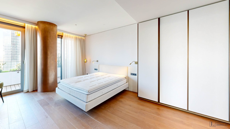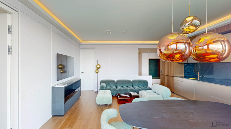 Die Wohnung wird vollständig möbliert angeboten und ist mit ausgewählten Designklassikern ausgestattet, darunter das Camaleonda-Sofa von B&B Italia, Essmöbel von Maxalto sowie sorgfältig kuratierte Stücke von Minotti, Acerbis und Treku. Das Ergebnis ist ein harmonisches, zeitloses Einrichtungskonzept.