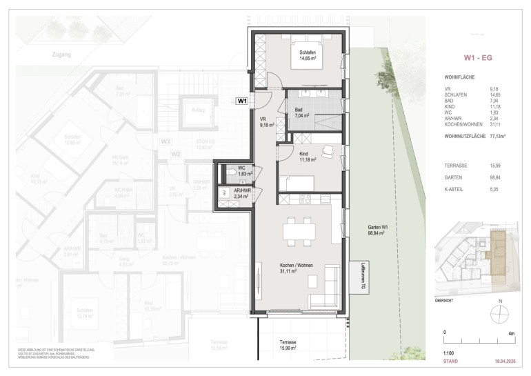 Diese moderne 3-Zimmer-Gartenwohnung überzeugt durch ein durchdachtes Raumkonzept und einen außergewöhnlich großzügigen Außenbereich. Auf rund 77 m² Wohnnutzfläche bildet der offen gestaltete Wohn-, Koch- und Essbereich mit ca. 31 m² das Herzstück der Wohnung und schafft ein einladendes, lichtdurchflutetes Wohngefühl. Ergänzt wird das Raumangebot durch ein komfortables Schlafzimmer sowie ein weiteres Zimmer, das sich ideal als Kinder-, Gäste- oder Arbeitszimmer eignet. Ein modernes Badezimmer, ein separater Abstellraum sowie ein einladender Vorraum sorgen für zusätzlichen Komfort und Funktionalität. Ein besonderes Highlight ist der private Außenbereich: Die ca. 16 m² große Terrasse sowie der großzügige Eigengarten mit rund 99 m² bieten eine perfekte Erweiterung des Wohnraums ins Freie und schaffen eine exklusive Wohlfühloase für entspannte Stunden im eigenen Zuhause.