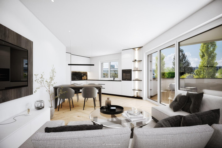 Die Ausstattung erfüllt höchste Ansprüche: Edler Fischgrätparkett, exklusive Armaturen von Dornbracht sowie ausgewählte Materialien schaffen ein elegantes Wohnambiente. Bodentiefe Fensterflächen sorgen für lichtdurchflutete Räume und fließende Übergänge zwischen Innen- und Außenbereich. Modernste Haustechnik wie Fußbodenheizung, Fernwärme, Wohnraumlüftung und Photovoltaik garantiert nachhaltigen und komfortablen Wohnstandard. Das Gebäude ist barrierefrei und verfügt über einen Lift mit direktem Zugang von der Tiefgarage zu allen Wohnungen.