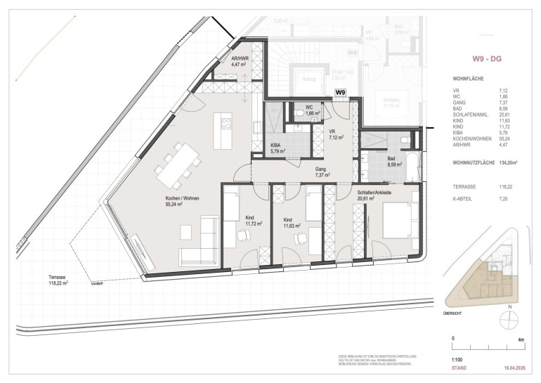 Dieses außergewöhnliche 4-Zimmer-Penthouse bildet den architektonischen Höhepunkt des Projekts und vereint Großzügigkeit, Design und Wohnkomfort auf höchstem Niveau. Mit einer Wohnnutzfläche von ca. 135 m² sowie einer beeindruckenden Terrasse von rund 119 m² entsteht ein Wohntraum der Extraklasse. Das Herzstück bildet der großzügige Koch-, Wohn- und Essbereich mit ca. 55 m², der ein einzigartiges Raumgefühl schafft und den idealen Rahmen für stilvolles Wohnen und repräsentative Momente bietet. Besonders hervorzuheben ist der elegante Masterbereich mit Schlafzimmer, Ankleide und Bad en suite, der als privater Rückzugsort höchsten Ansprüchen gerecht wird. Zwei weitere Zimmer bieten flexible Nutzungsmöglichkeiten, ergänzt durch ein eigenes Kinderbad. Ein Abstellraum sowie ein separates Gäste-WC sorgen für zusätzlichen Komfort und runden dieses exklusive Wohnangebot perfekt ab.