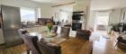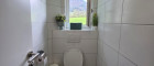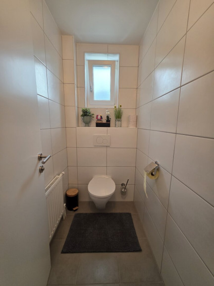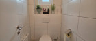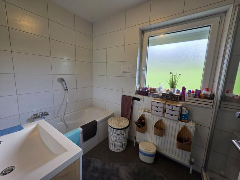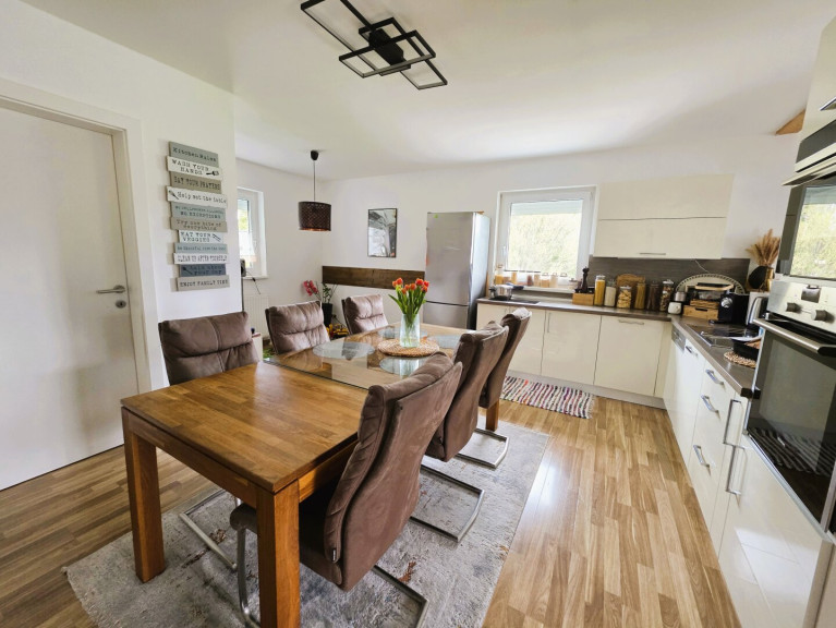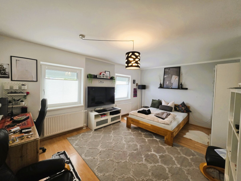 Das Obergeschoss verfügt über ein weiteres Badezimmer, eine separate Toilette, zwei Schlafzimmer sowie eine Wohnküche mit Zugang zum Balkon.