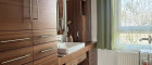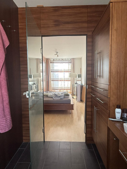 Schlafzimmer vom Tischler maßgefertigt, sowie ein stilvoll gestaltetes Badezimmer mit sehr viel Stauraum.