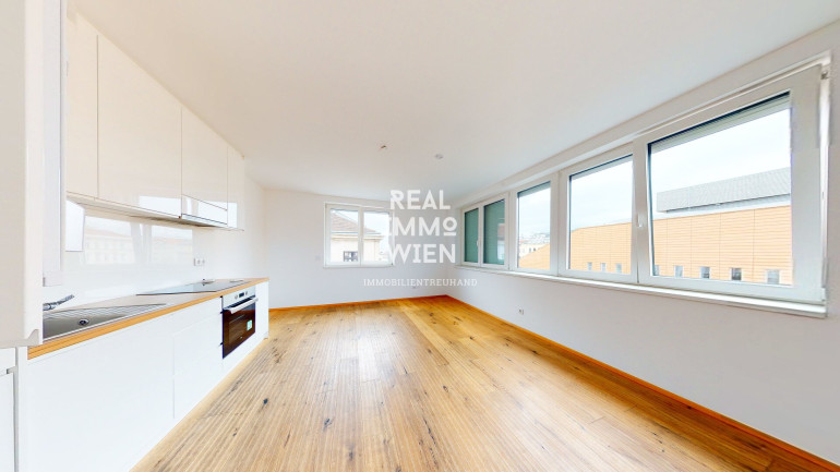 Die Wohnung überzeugt durch eine hochmoderne Einbauküche, qualitativ hochwertige Parkettböden sowie stilvoll verflieste Sanitärräume.