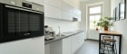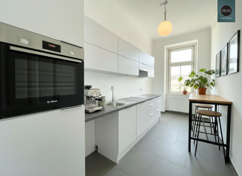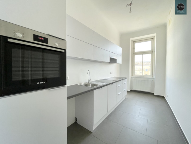 - 1 Große Küche inkl. Einbauküche mit allen Geräten, Waschmaschinenanschluss sowie einem Fenster (Hofseite)