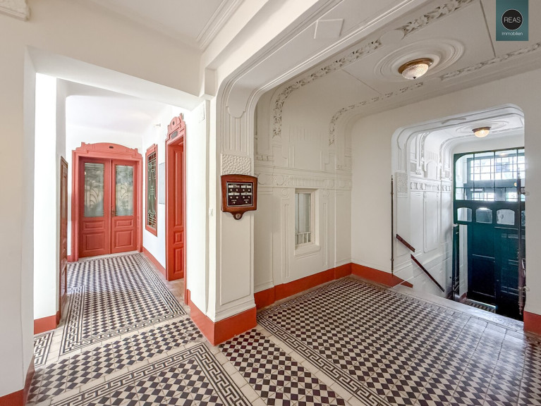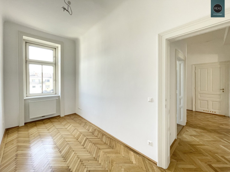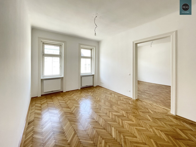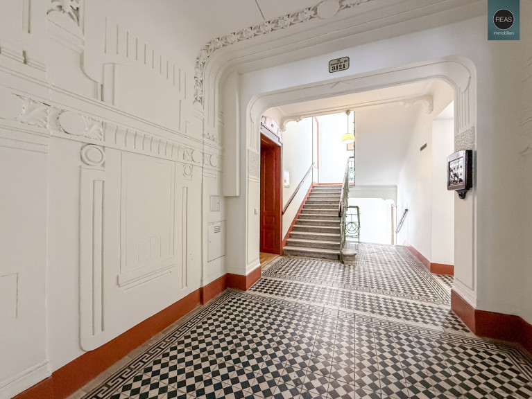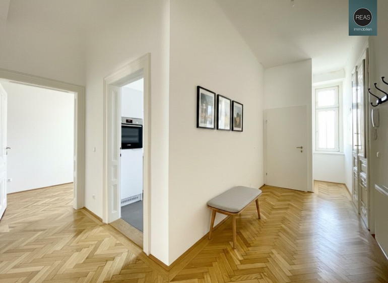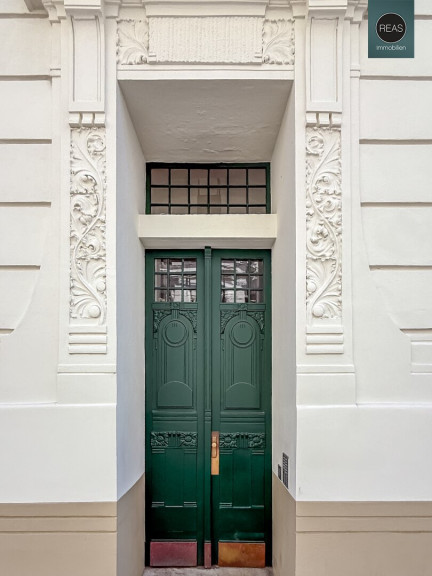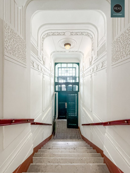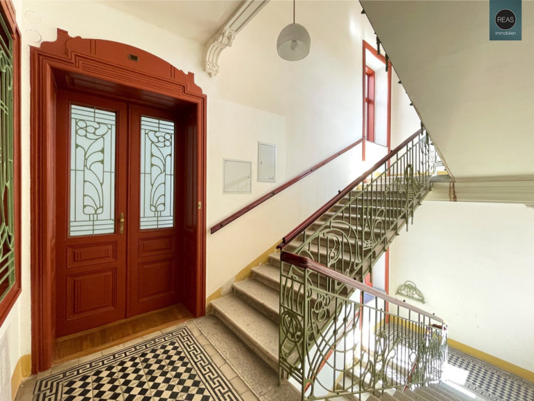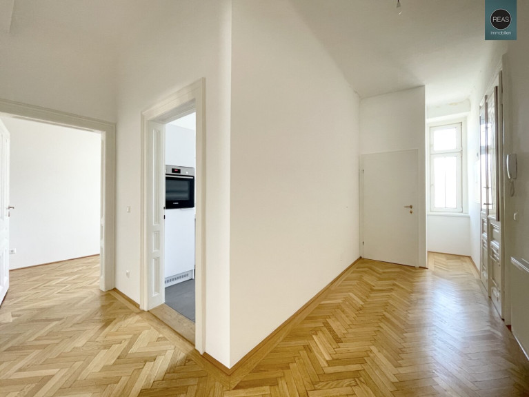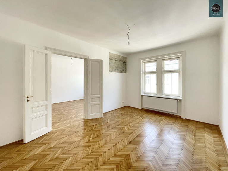 Ausstattung: Hohe Raumhöhe, Echtholz Parkettboden, Flügeltüren, Kunststoff-Isolier-Fenster, wunderbar erhaltene Wandverzierungen aus einer vergangenen Zeit