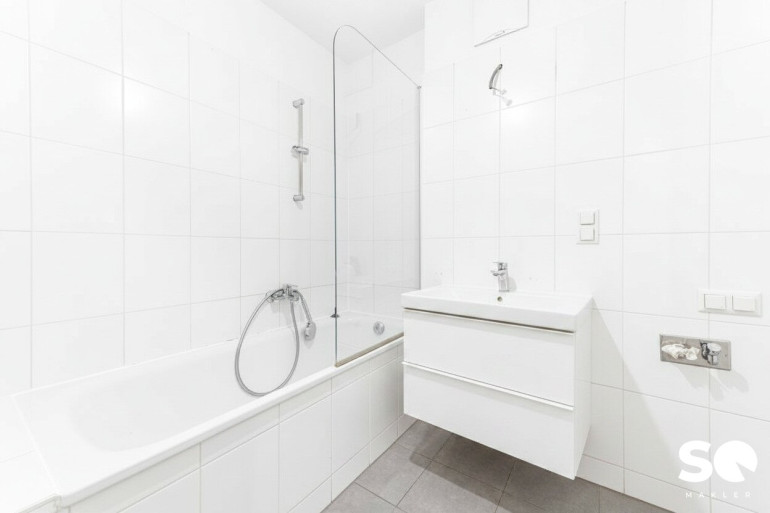 Mit Badewanne, Waschbecken und Waschmaschinenanschluss.