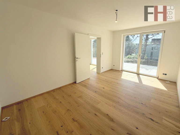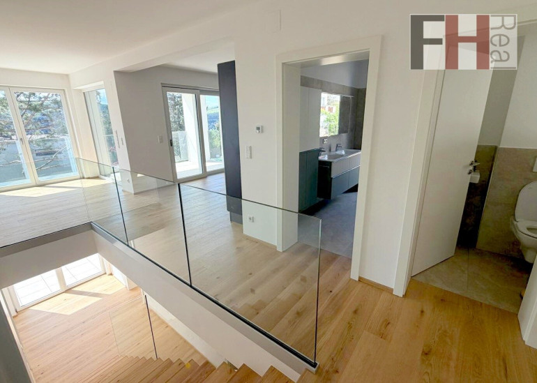 Über den großen überdachten Eingangsbereich, in dem sich auch die beiden PKW Stellplätze befinden, betreten Sie das Haus, das sich durch seine Ausrichtung im Inneren angenehm hell und freundlich präsentiert. Von hier aus gelangen Sie über den Vorraum und den Flur zum knapp 35m² großem Herzstück des Hauses, dem 23,5m² großen lichtdurchflutenden Wohnzimmer mit Essbereich und französischem Fenster sowie zur offenen Küche mit über 11m², die hochwertig, modern und vollausgestattet ist. Von diesen Räumlichkeiten aus betritt man die etwa 9m² große überdachte Terrasse mit herrlichem Ausblick in den Wienerwald und den eigenen Garten. Erwähnenswert sind hier die Glaswände anstatt eines Geländers, welche ein Gefühl von Weite und Offenheit zur herrlichen grünen Umgebung vermitteln.