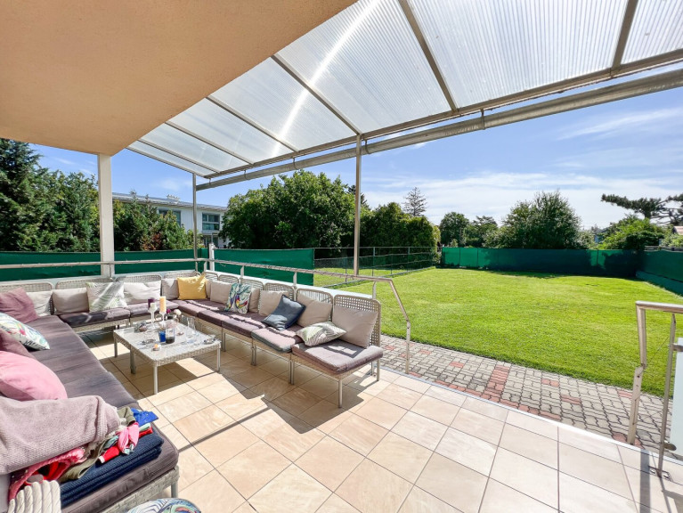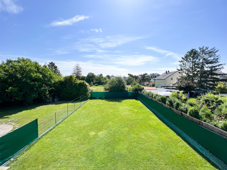 - ein knapp 38 m2 großes Wohnzimmer mit Ausgang zur zirka 22 m2 großen Terrasse und zum Garten