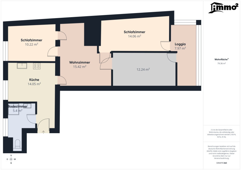 - Zugang Loggia: Von zwei Zimmern aus begehbar