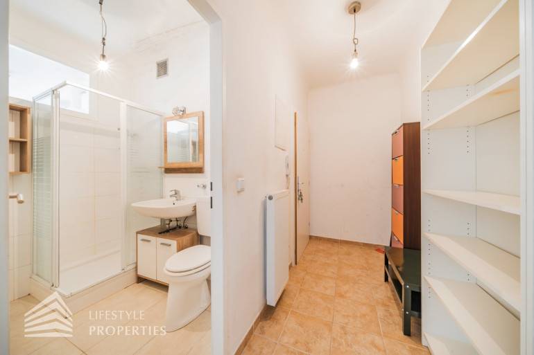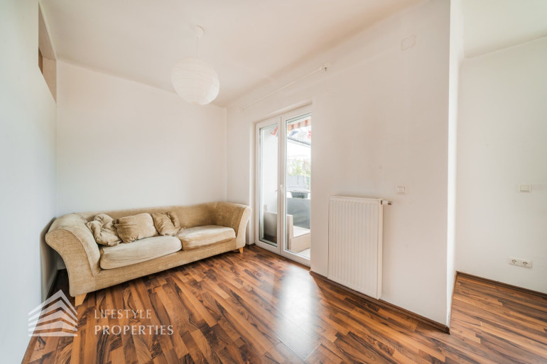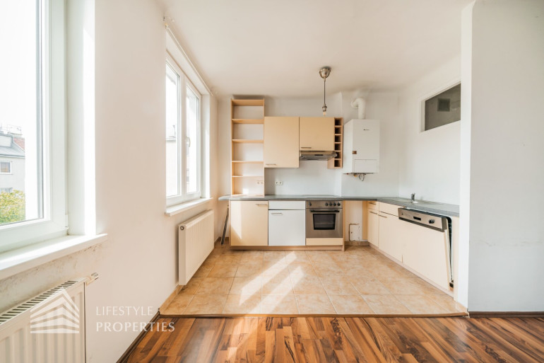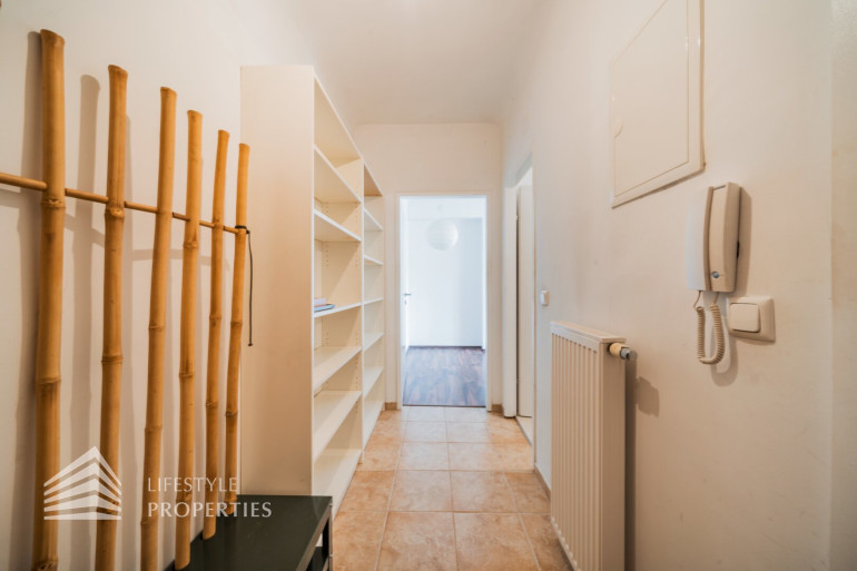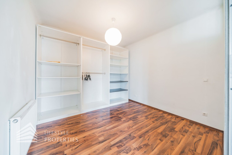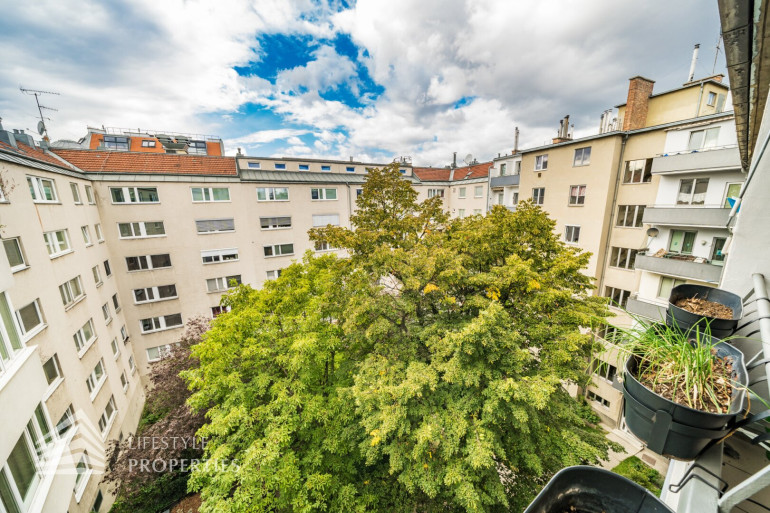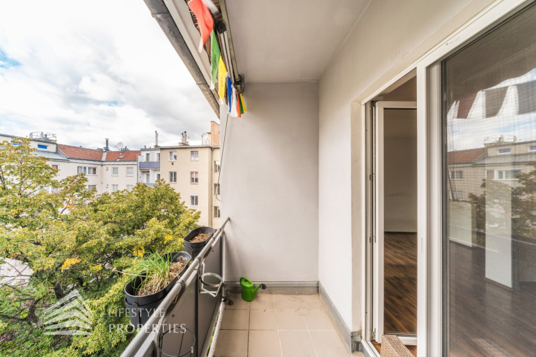 Die Räumlichkeiten der ca. 56 m² großen, charmanten Wohnung, welche sich im fünften Stock ohne Aufzug befindet, sind mit ansprechenden Laminat verlegt und Vorzimmer, Badezimmer und Küche geschmackvoll verfliest. Alle Wände wurden in neutralem weiß gestrichen. Vom Vorzimmer, welches mit einem Schuhschrank und einem großen, deckenhohen Regal ausgestattet ist, gelangen Sie rechter Hand ins Badezimmer. Darin befindet sich eine Dusche, das Waschbecken mit Spiegel und Unterschrank, die Toilette, ein Waschmaschinenanschluss sowie ein Hängeschrank, farblich harmonisch miteinander abgestimmt. Am Ende des Ganges kommen Sie ins Schlafzimmer, welches einen offenen Kleiderschrank über die gesamte Rückwand aufweist. Die offen gestaltete Wohn-Küche ist ein absolutes Highlight dieser Wohnung. Durch zwei Fenster und die Glastür, welche zum Balkon führt, wirkt der Raum hell und behaglich. Hier herrscht genügend Platz um zu kochen, zu essen und sich zu erholen, ohne den Raum oder die Gesellschaft verlassen zu müssen. Auch bei der Küche wurde viel Wert auf abgestimmte Farben gelegt, ausgestattet mit einen Herd, einen Geschirrspüler, einen Kühlschrank sowie eine Spüle mit Ober- und Unterschränken. Der Balkon blickt in den ruhigen Innenhof und bietet genügend Platz im Freien um verweilen zu können.