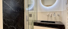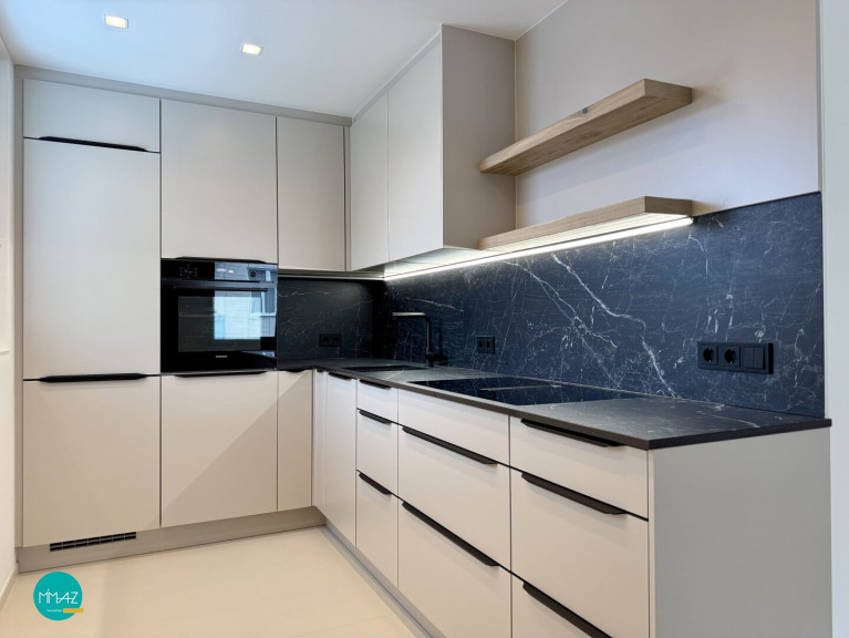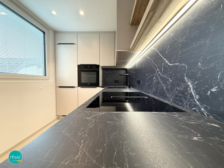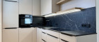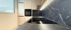 Die Küche ist der absolute Blickfang mit ihren weißen Fronten und der tiefdunklen Arbeitsplatte aus Dekton by Consentino - pflegeleicht, kratzfest und außergewöhnlich widerstandsfähig. Ausgestattet ist die Küche mit Siemens Geräten: Induktionskochfeld mit integriertem Dunstabzug, Backofen, NoFrost-Kühl-Gefrierkombi sowie ein vollintegrierte Geschirrspüler fügen sich harmonisch in das Gesamtbild ein.