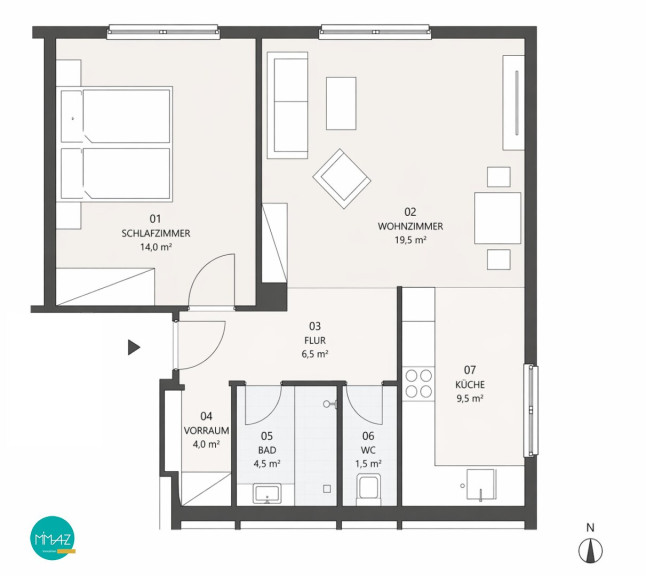 Vom Vorraum aus sind alle Zimmer zentral begehbar: der helle Wohnbereich mit offener Küche, das Schlafzimmer, das Wellness-Badezimmer mit angrenzender separater Toilette sowie der Abstellraum.