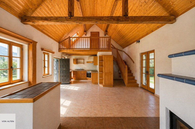 Der Wohnbereich des Zubaus überzeugt durch seine großzügige Raumhöhe sowie die offene Galerie im Dachgeschoss.