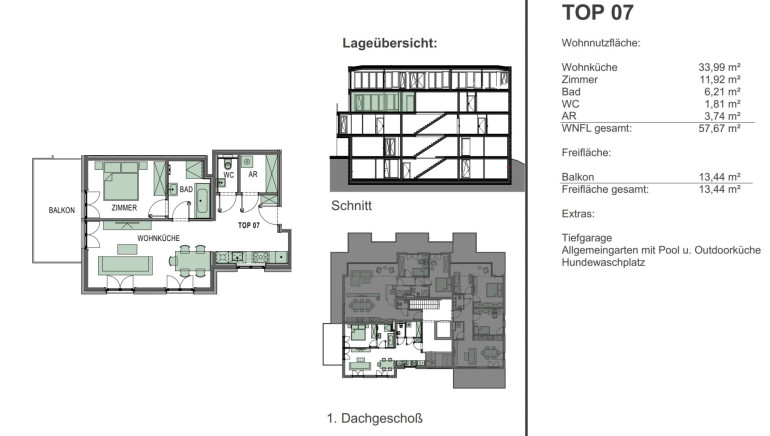 Diese hochwertig geplante Zweizimmerwohnungen (TOP 07) befindet sich im 1. Dachgeschoß und verfügt über eine ideale Raumaufteilung mit moderner Ausstattung und großzügigen Freiflächen. Die Wohnküche mit 33,99 m2 ist das Herzstück der Wohnung und bietet dank großflächiger Verglasung einen direkten Zugang zur Terrasse. Das Schlafzimmer ist ruhig gelegen.