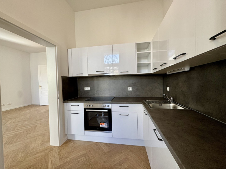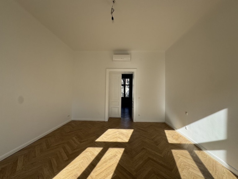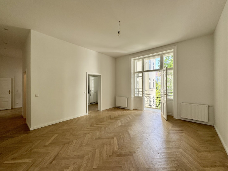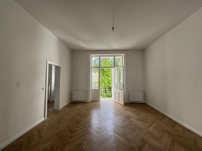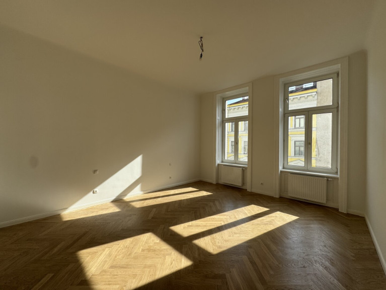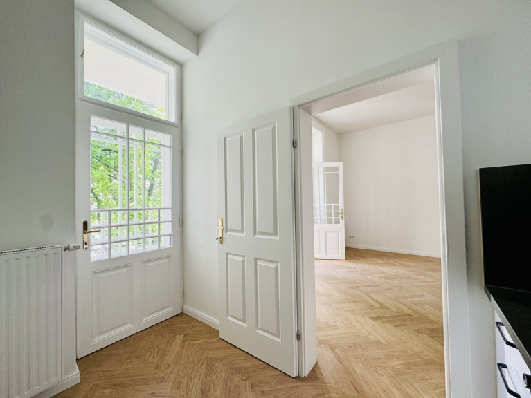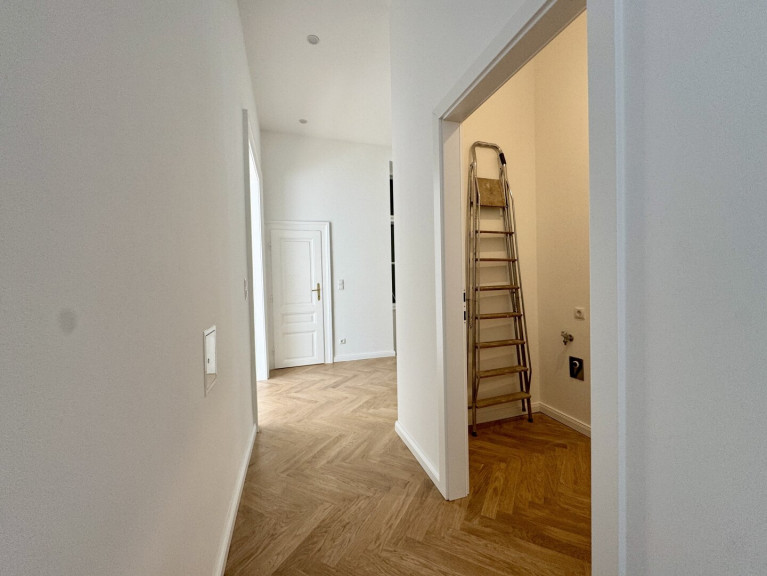 Ein hochwertiger Fischgrätparkett aus Eiche wurde neu verlegt. Im Vorraum sowie in den Sanitärräumen wurden moderne Deckenspots integriert. Die beeindruckende Raumhöhe von ca. 3,20 m verleiht der Wohnung ein besonders großzügiges und elegantes Wohngefühl und unterstreicht den klassischen Altbaucharakter.