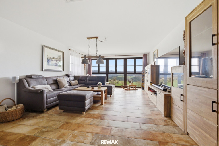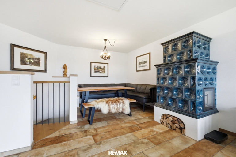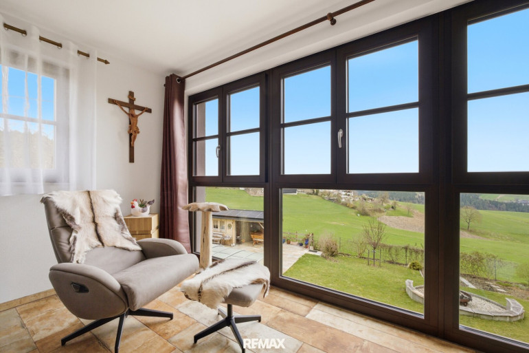 - großzügiges Wohnzimmer mit Panoramafenster & Kachelofen