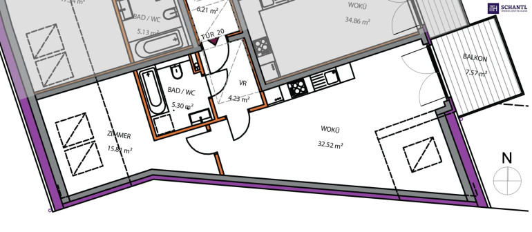Herzstück der Wohnung ist die beeindruckend helle, rund 32,5 m² große Wohn-Ess-Küche mit großzügigem Wohn- und Essbereich. Die bereits im Kaufpreis enthaltene Küchenzeile fügt sich harmonisch in den Raum ein und macht diesen Bereich zum perfekten Mittelpunkt des Wohnens. Von hier aus gelangen Sie auf den ca. 7,5 m² großen Ostbalkon mit Glasgeländer, der in den ruhigen Innenhof ausgerichtet ist und zu entspannten Morgenstunden einlädt.