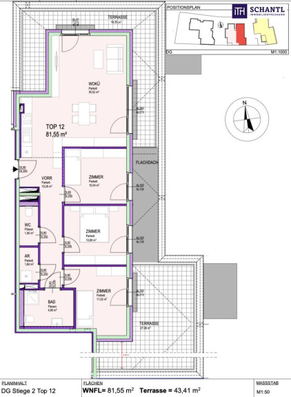 Wohnfläche: ca. 81,55 m² + 2 Terrassen: ca. 43,41 m² + Kellerabteil