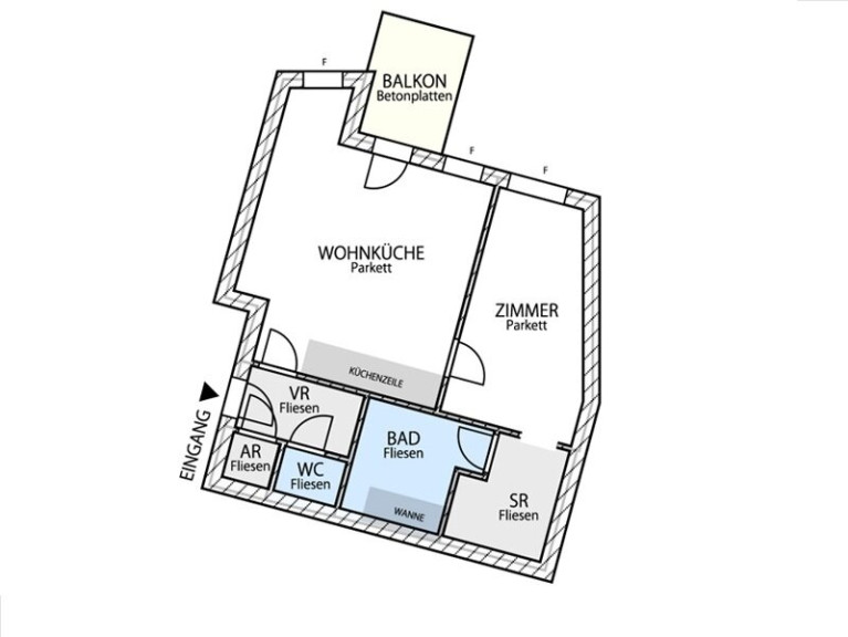 Fliesen, Parkett, Einbauküche, Wohnküche / offene Küche, Personenaufzug, Südbalkon, Badewanne