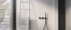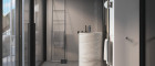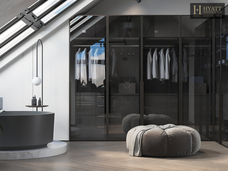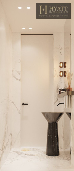 Wenn man die Wohnung betritt, gelangt man zunächst in einen Vorraum, von dem aus beide Schlafzimmer, das Badezimmer und der Stauraum erschlossen werden. Das größere Schlafzimmer verfügt über eine eigene Ankleide sowie ein großzügiges ensuite Badezimmer mit Badewanne und Dusche. Ein weiteres Badezimmer sowie ein separates WC ergänzen das Raumangebot dieser Ebene.