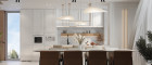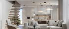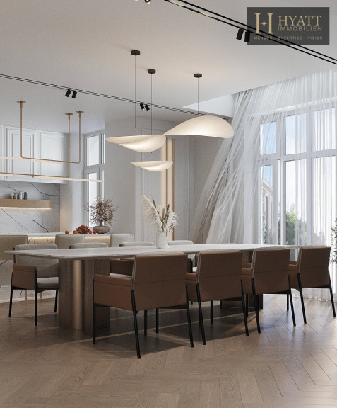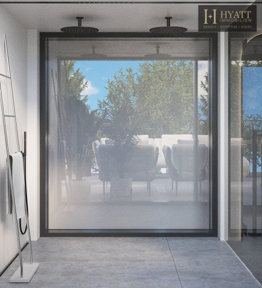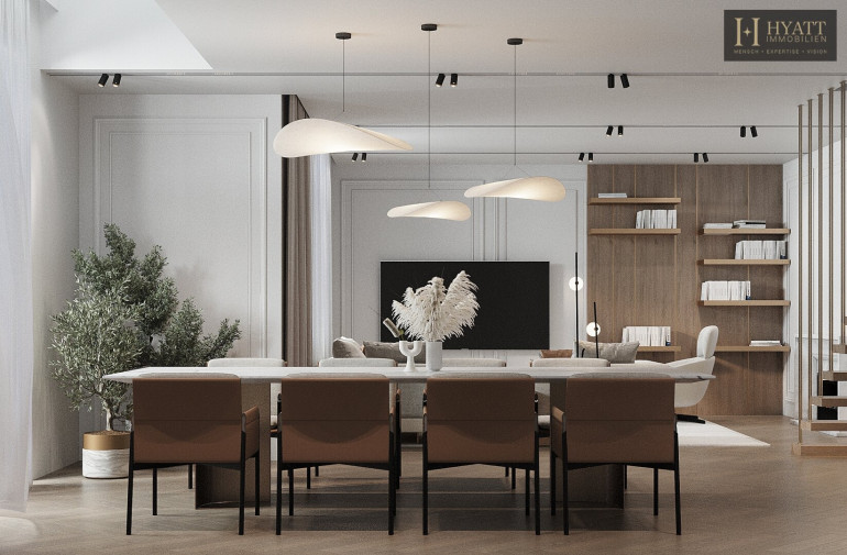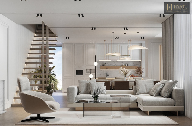 Über die zentrale Treppe erreicht man den oberen Wohnbereich, der mit seiner offenen Gestaltung und den großen Fensterflächen ein lichtdurchflutetes Ambiente schafft. Die Wohnküche bietet viel Platz für Kochen, Essen und Wohnen und öffnet sich direkt zu zwei der Terrassen mit schönem Ausblick in die grüne Umgebung. Eine weitere große Terrasse befindet sich auf derselben Ebene und bietet ideale Möglichkeiten für entspannte Stunden im Freien.
