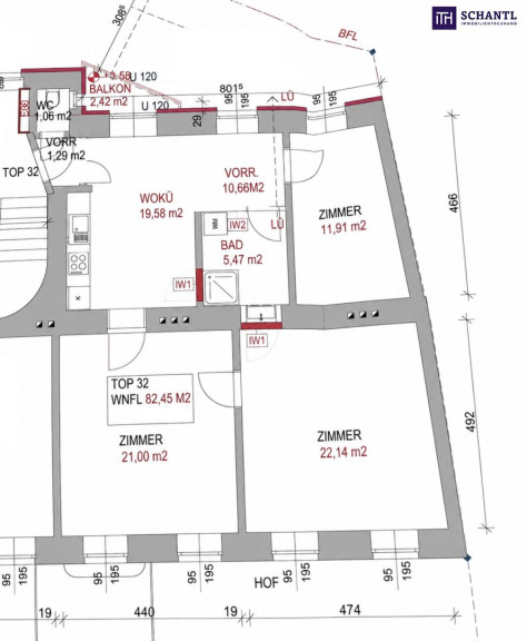 Wohnfläche: ca. 82,45m² + Balkon: ca. 2,42m² + Kellerabteil