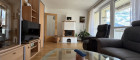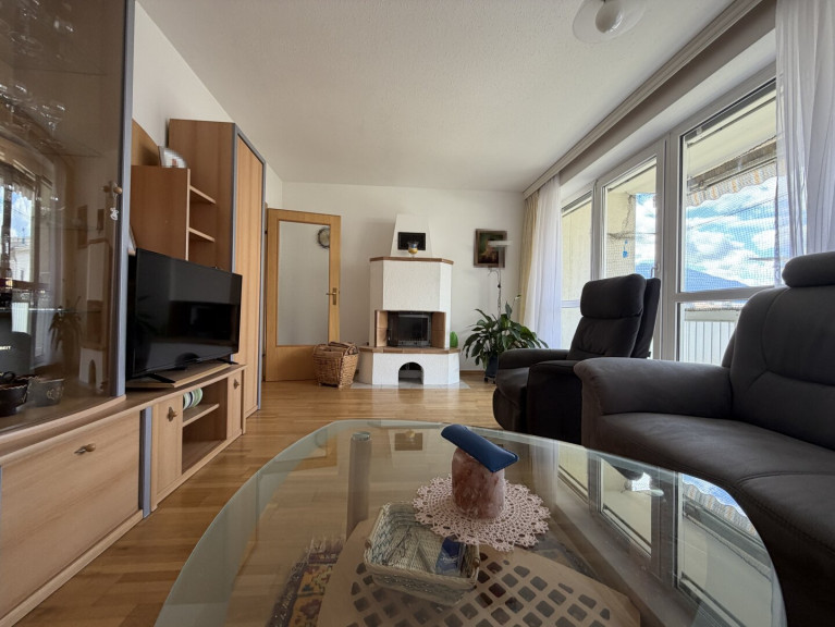 - Wohnzimmer mit gemütlichem Kaminofen und Zugang zur westseitigen Loggia