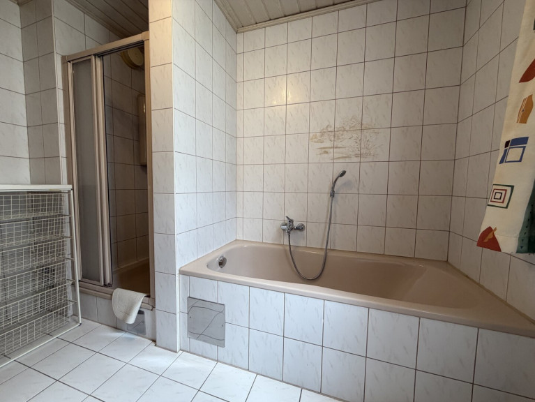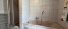 - Badezimmer mit Fenster, Dusche und Badewanne