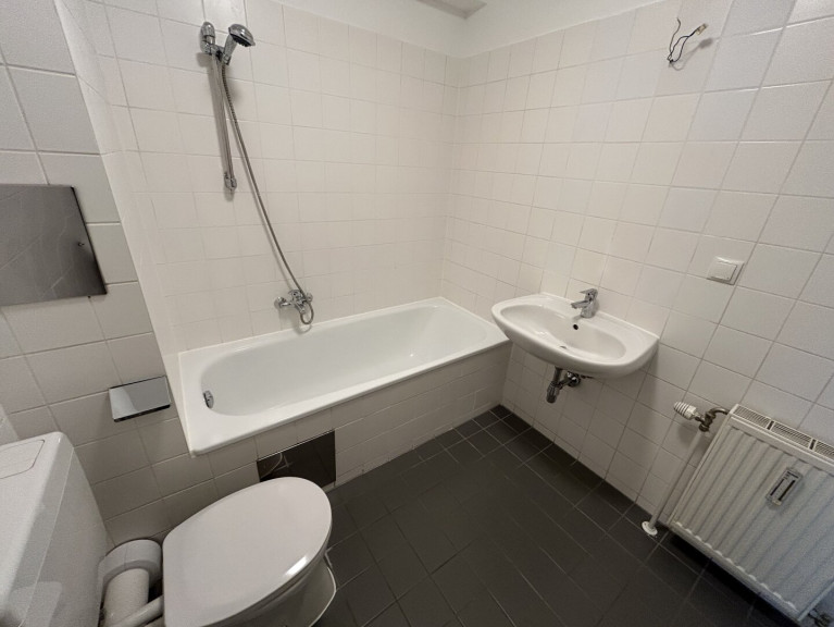 Große Fenster sorgen für angenehmes Tageslicht und schaffen eine freundliche Wohnatmosphäre. Das Badezimmer verfügt über eine Badewanne sowie WC und präsentiert sich funktional und sehr gepflegt.