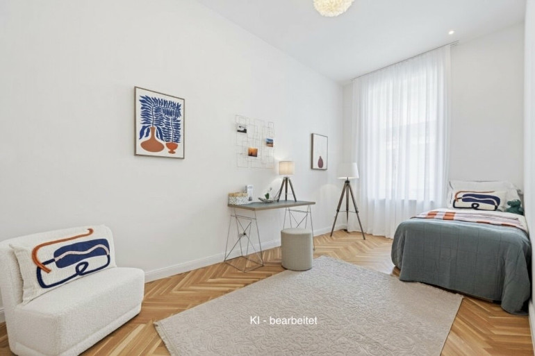 Die Wohnung wird grundsätzlich, bis auf die Einbauküche, unmöbliert verkauft. Sie wird im Rahmen eines professionellen Home-Staging-Services teilweise möbliert präsentiert und teilweise sind die Fotos mit KI-bearbeitet.