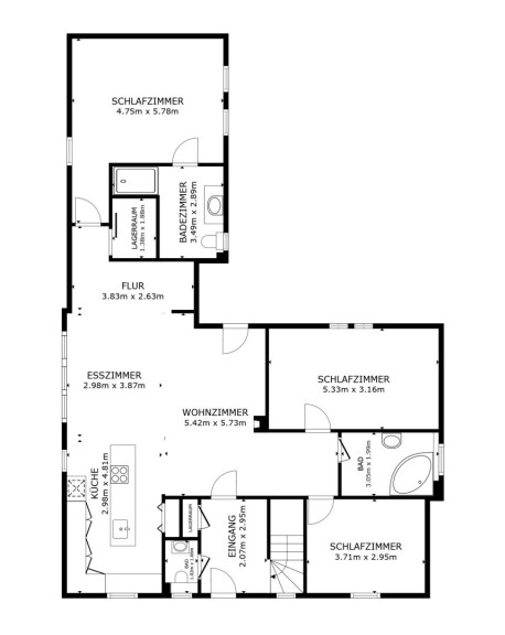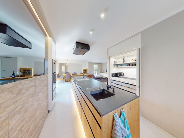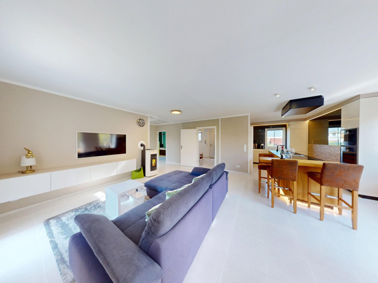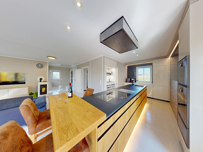 Vier helle Zimmer auf einer Ebene erwarten Sie hier. Der Wohn-/Essbereich mit über 50m² Fläche ist Zentrum und Wohlfühlplatz. Dafür sorgt nicht nur der Pelletofen, der angenehme Wärme spendet, sondern vor allem auch die geniale Küche im Neuwert von ca. 25.000,-, in der sich selbst Profiköche wie zuhause fühlen.