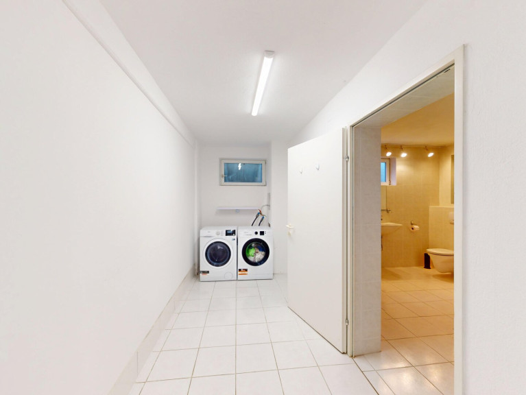 Das - sowohl über das Vorzimmer, als auch von außen begehbare - Kellergeschoß lässt keine Wünsche offen. Es ist aufgeteilt in einen großen Hauptraum, einen Nassraum mit Dusche und einen weiteren Lagerraum, sowie eine Nische für Waschmaschine und Trockner. Hier ist vieles möglich: Fitnessraum, Sauna, Partykeller, Gästeraum oder einfach viel Lagerfläche.
