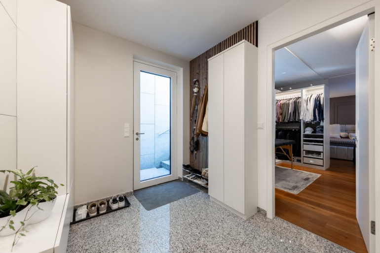 Im Erdgeschoss befindet sich die großzügige, lichtdurchflutete Wohnbereich, ausgestattet mit einer maßgefertigten Tischlerküche und angrenzender Speis. Bodentiefe Glasfronten eröffnen den direkten Zugang zur sonnigen Terrasse und dem eleganten Pool, ein Gäste-WC komplettiert diese Ebene. Im ersten Obergeschoss erwarten Sie zwei Schlafzimmer mit Zugang zu einem Balkon, ein Schrankraum sowie ein Badezimmer mit WC – perfekte Rückzugsbereiche für Ruhe und Komfort. Der vollwertig ausgebaute Wohnkeller bietet ein weiteres Schlafzimmer mit Garderobenraum und Zugang zum Garten, ein Badezimmer mit WC, einen praktischen Abstellraum sowie einen separaten Raum mit Saunaanschluss. Die uneinsichtige, weitläufige Dachterrasse mit Whirlpool eröffnet einen unvergleichbaren Panoramablick über die Weinberge und die Umgebung.