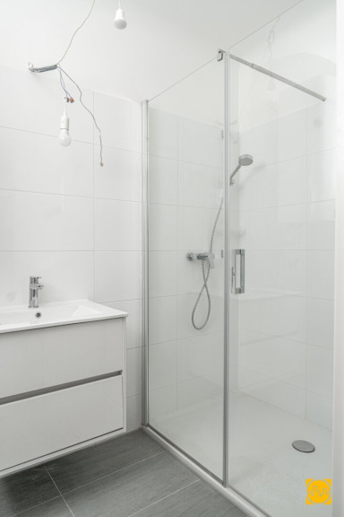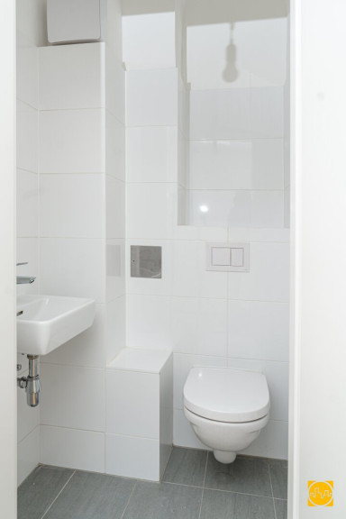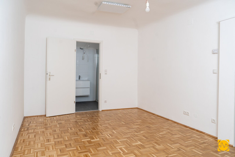 Das Schlafzimmer verfügt über ein direkt angeschlossenes Badezimmer mit neuwertiger Dusche – kompakt, modern und funktional. Auch das separate WC präsentiert sich in ausgezeichnetem Zustand.