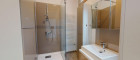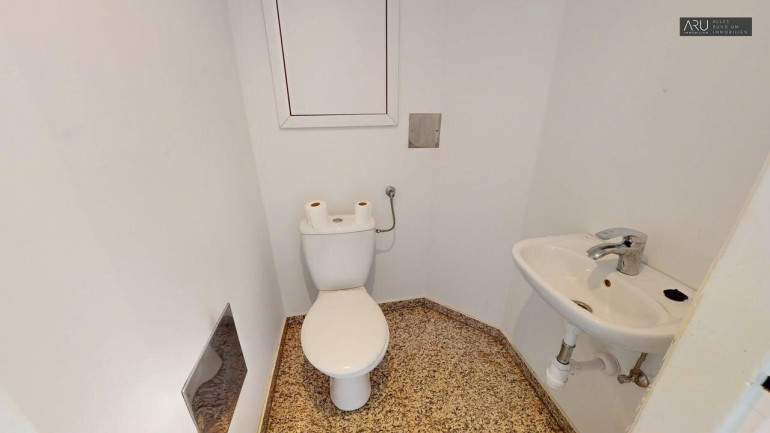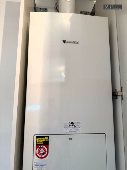 Das Badezimmer verfügt über eine Dusche und ist modern gestaltet. Die Toilette ist separat angeordnet, was zusätzlichen Komfort bietet. Für Warmwasser sorgt eine Gas-Kombitherme mit Durchlauferhitzer.
