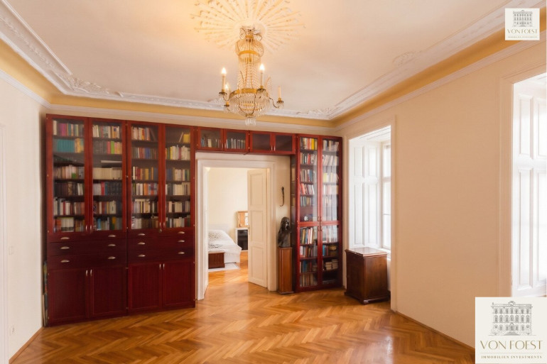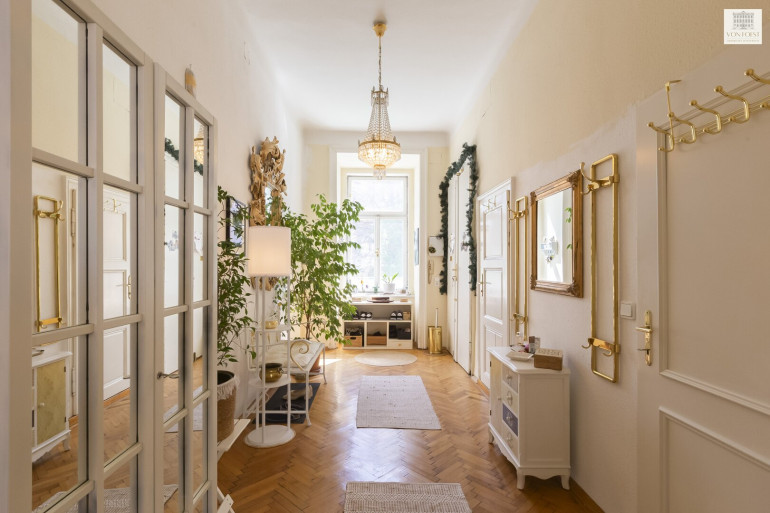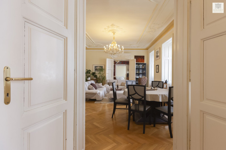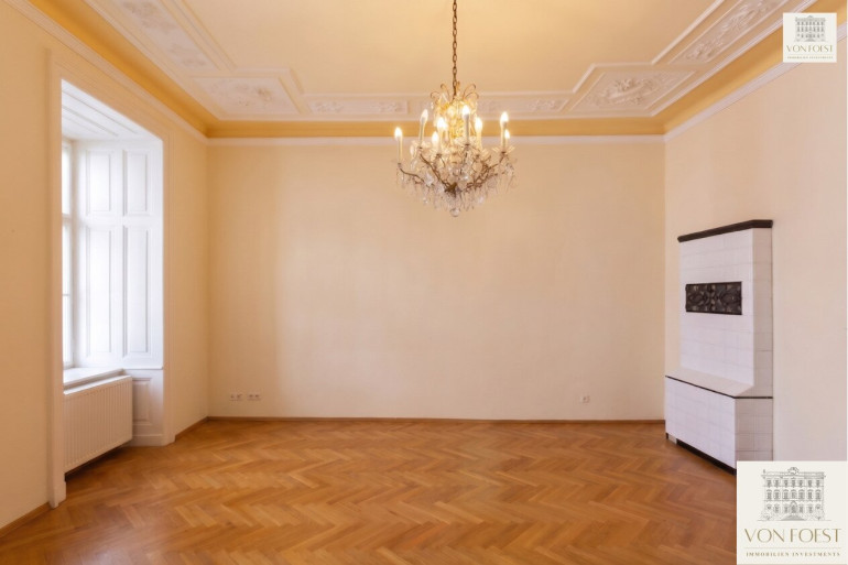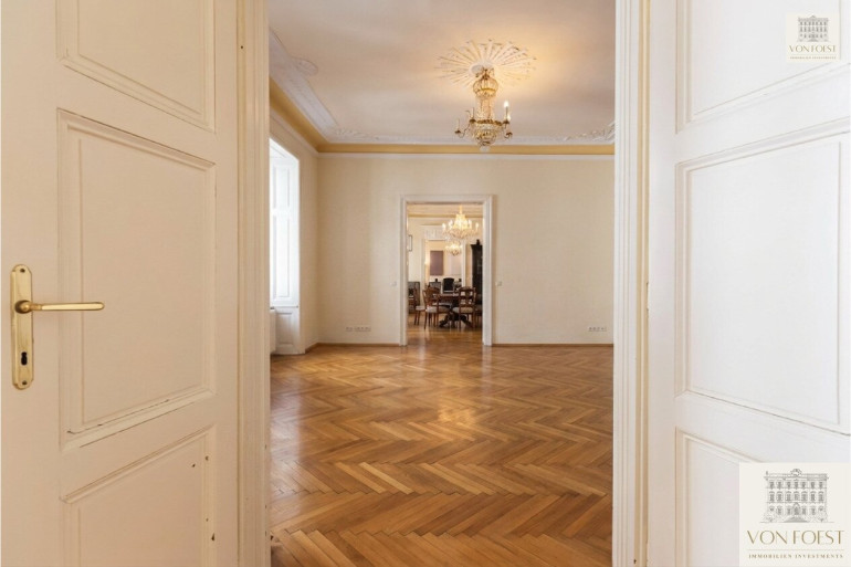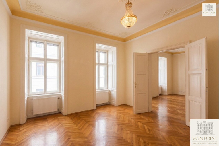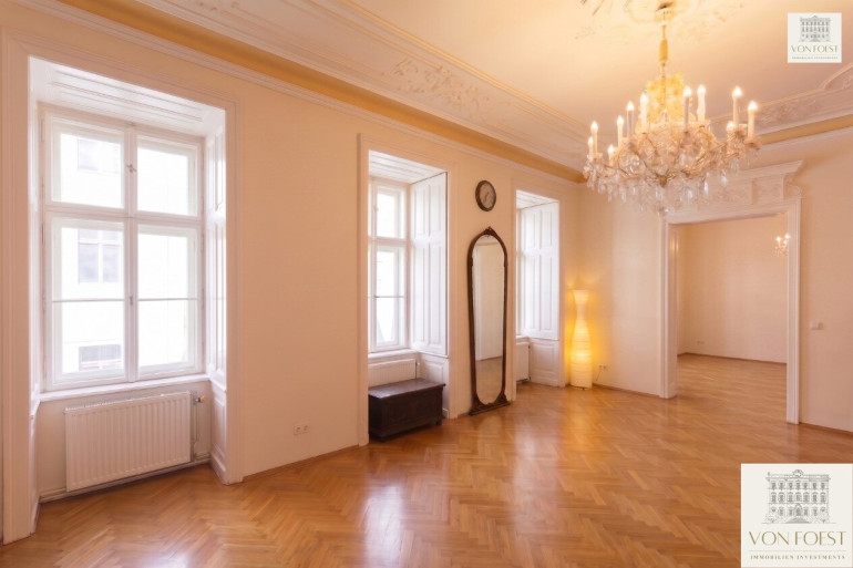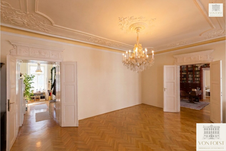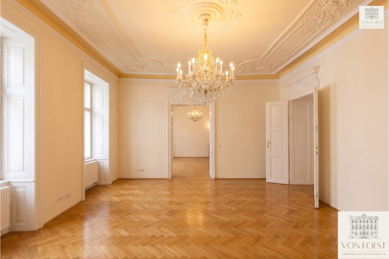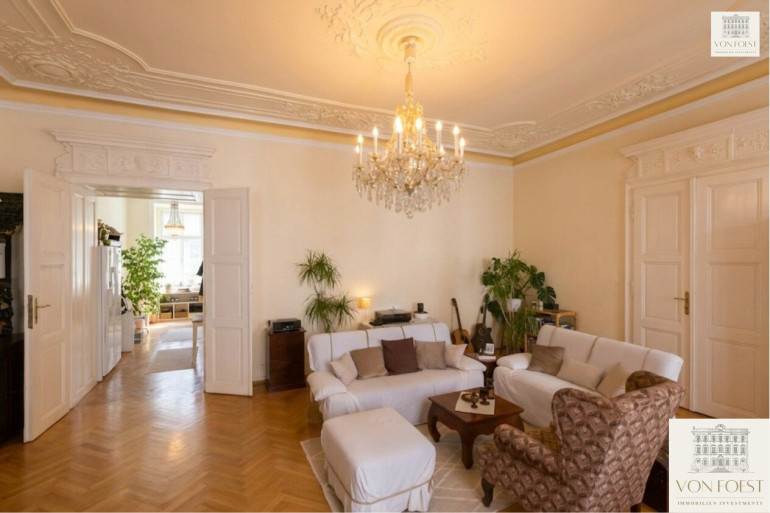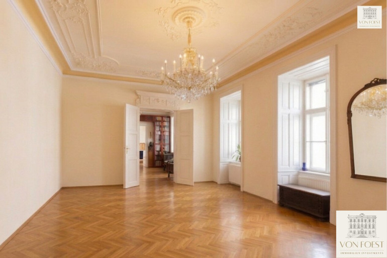 In einem prachtvollen Wiener Altbau, dessen stilvolle Fassade bereits von außen die Eleganz vergangener Epochen widerspiegelt, präsentiert sich diese außergewöhnliche Residenz als wahres Wohnjuwel. Auf rund 170 Quadratmetern entfaltet sich ein Raumgefühl von seltener Großzügigkeit – geprägt von beeindruckenden Raumhöhen, lichtdurchfluteten Zimmern und einer klassischen, repräsentativen Grundrissgestaltung.