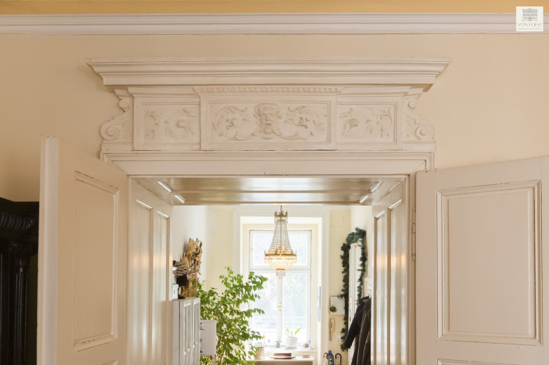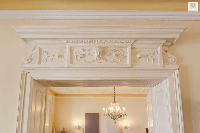 Beim Betreten der Wohnung offenbart sich sofort die besondere Qualität dieser Immobilie: kunstvoll gearbeiteter Originalstuck schmückt die Decken, stilvolle Flügeltüren verbinden die Räume in harmonischer Enfilade und unterstreichen den unverwechselbaren Charakter dieser Immobilie.