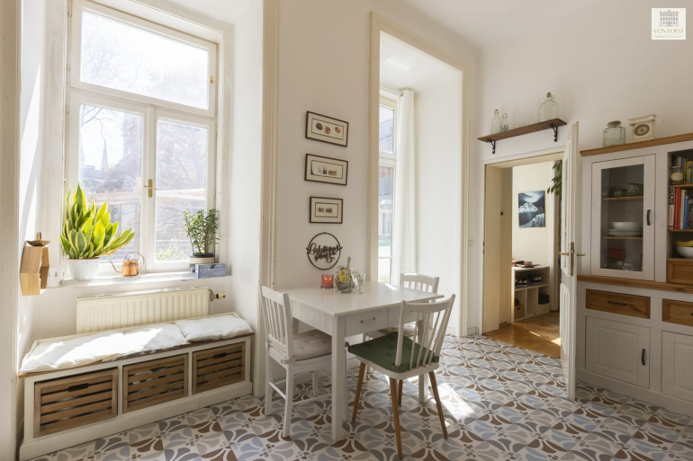 Diese Wohnung vereint in seltener Symbiose den unverwechselbaren Charme eines historischen Wiener Altbaus mit einer außergewöhnlich großzügigen Terrasse, die mit Blick auf die Votivkirche zu einer grünen Ruheoase mitten in der Stadt wird.