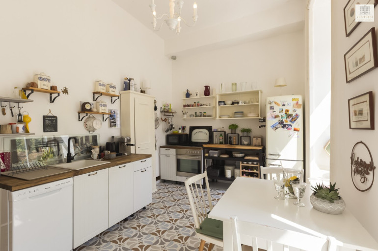 Das Herzstück bildet der großzügige Wohnsalon. Hohe Fensterfronten durchfluten den Raum mit Tageslicht und schaffen eine helle, einladende Atmosphäre, die den historischen Charme perfekt ergänzt.