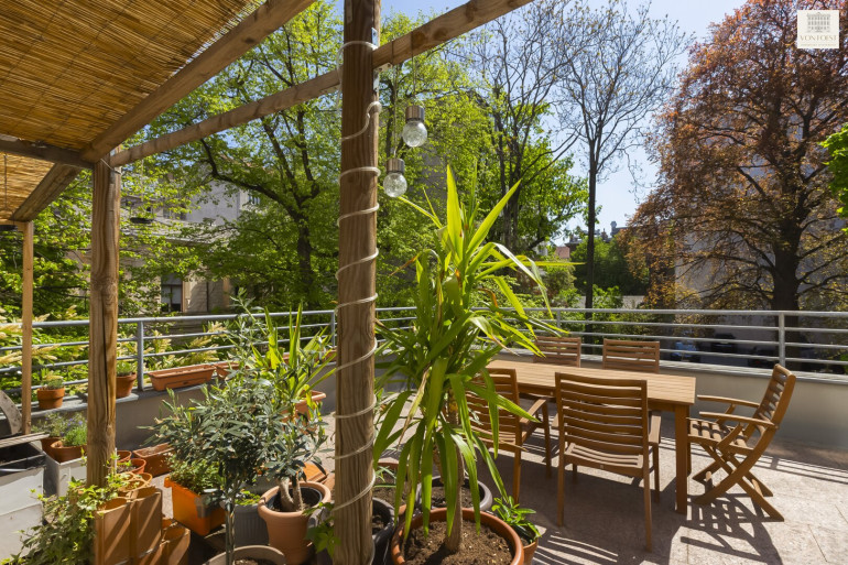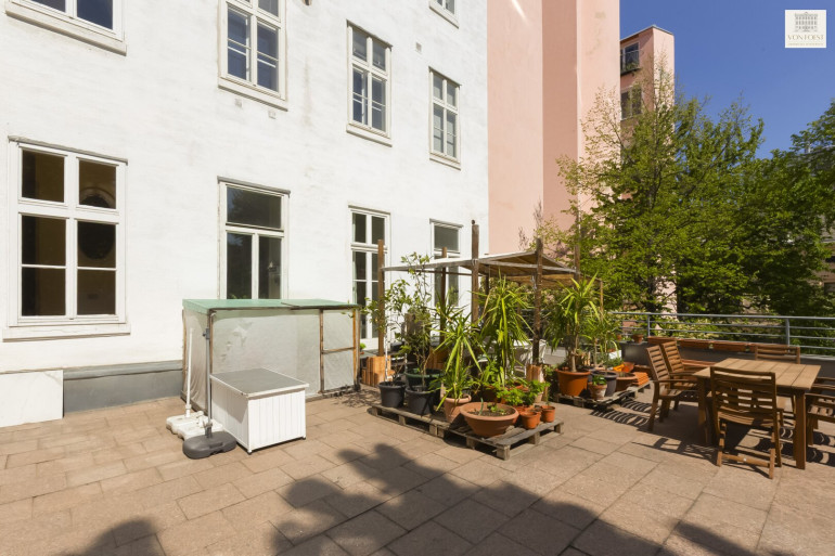 Von der Küche aus eröffnet sich der Zugang zur außergewöhnlich großen Terrasse – Der Außenbereich ist in dieser Form eine absolute Rarität: Diese riesige Freifläche ist nicht nur ein Rückzugsort mitten in der Stadt, sondern eine grüne Oase, die urbanes Leben mit Privatsphäre auf einzigartige Weise verbindet. Die Terrasse bietet reichlich Platz für Loungemöbel, einen großzügigen Essbereich oder Urban Gardening. Der unvergleichliche Blick auf die Votivkirche, besonders bei stimmungsvoller Beleuchtung am Abend, verleiht diesem Ort eine fast magische Aura.