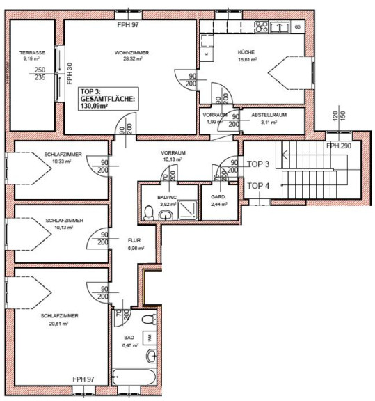 Raumaufteilung: Die Wohnung bietet einen großzügigen Wohn- und Essbereich mit direktem Zugang zur Terrasse. Drei weitere Zimmer eignen sich ideal als Schlafzimmer, Kinderzimmer oder Homeoffice. Eine separate Küche sowie ein Badezimmer und ein zusätzliches WC runden das Raumangebot ab.