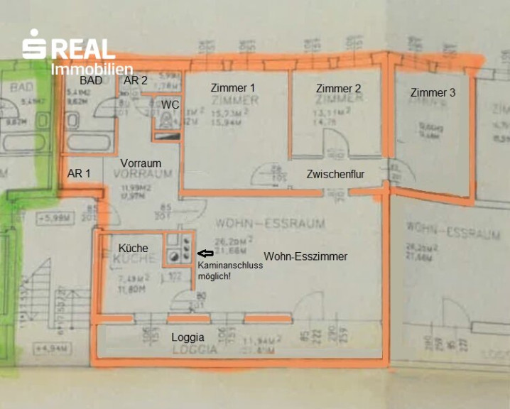 Ein weiterer Pluspunkt ist der vorhandene Kaminanschluss im Wohnzimmer – ideal für die Installation eines Kaminofens und gemütliche Stunden in behaglicher Atmosphäre.