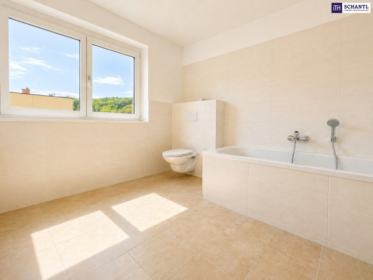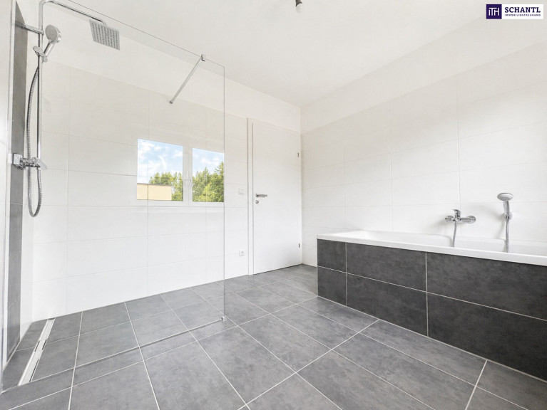 Im Obergeschoss stehen drei Schlafzimmer sowie ein stilvolles Badezimmer mit Badewanne, Walk-In-Dusche und Doppelwaschbecken zur Verfügung. Ein zusätzliches WC sorgt für Komfort im Alltag.