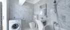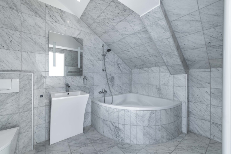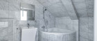 - Badezimmer mit Eckbadewanne, Waschtisch und WC